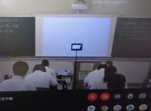 井原高校南校地では、新型コロナウイルス感染症の影響で、臨時休業や、やむを得ず登校できない生徒への緊急時の対応に備えるため、教師が、地域生活科1年生を対象に、教室にいる生徒と、教卓や教室の後方に設置したICT端末に向かって話す形式で行う同期型オンライン授業を試行しました。今回は、職員室にいる教師のchromebook等の画面で、黒板やスクリーン、教師の姿を確認することができました。この取組の成果と課題を検証し、上記の事情で生徒が自宅にいる場合には、オンラインで参加できるよう、学びの継続に取り組んでいく予定です。
