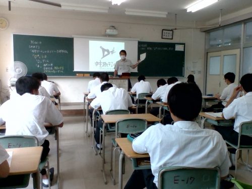 授業で井原デニムについて学びました。D♯のロゴに込められた思いや、今日に至るまでの歴史を学びました。授業後半では、校内で栽培しているワタの「摘心」を行いました。摘心を行うことで、分枝を増やすことができます。