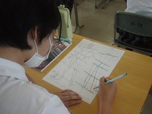 家政科2年ファッションデザイン類型7名と地域生活科1年ヒューマンライフコース20名が、デザイン画について学びました。 1日目は、プロポーションの描き方を教えていただき、2日目は、先生にアドバイスをいただきながら、それぞれ自由に服のデザインをしました。パステルや筆など様々な画材を使用した着色の技法も学びました。 デザイン画が苦手だった人もバランスの良いプロポーション画が描けるようになり、服をデザインする楽しさも教わりました。