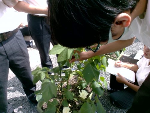 授業で井原デニムについて学びました。D♯のロゴに込められた思いや、今日に至るまでの歴史を学びました。授業後半では、校内で栽培しているワタの「摘心」を行いました。摘心を行うことで、分枝を増やすことができます。