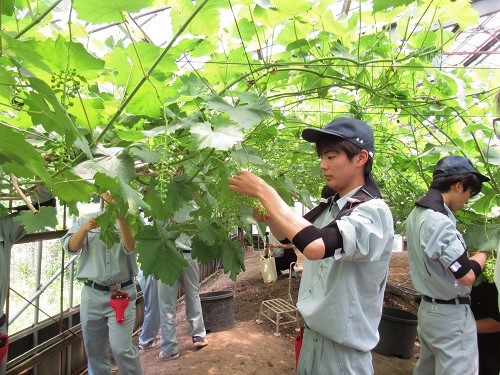 【園芸科】ブドウ栽培でスマート農業を体験未分類 / 2022年6月18日 本校園芸科及び地域生活科グリーンライフコースでは、地域の特産であるブドウ栽培に取り組んでおり、この時期は、腕上げ作業によるブドウの粒間引き実習を行っています。 今年度、JA共済連岡山からの支援を受け、農作業の負担を軽減するアシストスーツを導入したので、6月17日、園芸科の生徒が、実際に装着してブドウの粒間引きを行い、スマート農業を体験しました。 当日は、商品開発に携わったダイヤ工業株式会社職員の方から、岡山のブドウ産地をサポートするために商品づくりをしてきた経緯や、実際にアシストスーツの装着方法の説明を受けました。アシストスーツを装着した生徒からは、「作業がとても楽です」といった感想が聞けました。今後は、ブドウの粒間引きや収穫時にも活用して、負担軽減の効果について学習していきます。 なお、当日は、井原放送と山陽新聞の担当者による取材を受けました。