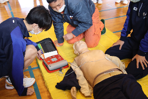 【普通科1年生】心肺蘇生法講習会普通科 / 2023年1月23日 1月23日(月)6,7限、北校地体育館において、保健体育の授業の一環として普通科1年生を対象の心肺蘇生法講習会を開催しました。 より専門的で現場の最前線で活躍されている方から知識と技術を学ぶため、井原消防署から3名の消防士をお招きしました。コロナ禍のため、人工呼吸を除いた胸骨圧迫、AEDの使用法を中心に学びました。生徒は全員、実際に救命救急法を行い、いざというときに備えました。本日のことを忘れずに、何かあったときには、活かせるようにして欲しいです。