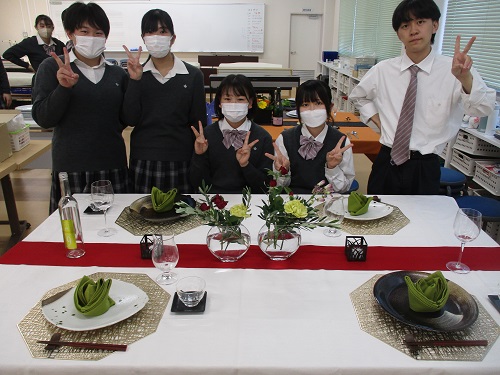 【地域生活科ヒューマンライフコース3年生】外部講師授業「テーブルコーディネート」ヒューマンライフコース, 未分類 / 2023年10月26日 10月18日(水) 地域生活科ヒューマンライフコース3年生が外部講師授業「テーブルコーディネート」を受講しました。 「ハロウィン」や「20歳姉の成人祝い」など、各グループでテーマを決め、先生方からもアドバイスを頂きながら、素敵なテーブルに仕上げることができました。花の高さや、配色、ナプキンの折り方など、知識も豊富に教えていただきました。 「少しの工夫で、食卓が華やかになることに気づけた」、「家でも、小さなことからやってみたい」など、学びを活かそうとする生徒の声もありました。講師の先生からも、「高校生らしい発想があり、面白かったです」と講評をいただきました。講師:小池佳子先生、最所養子先生授業内容:①テーブルコーディネートの概要②デモテーブルの説明③各班で実習④発表、講評