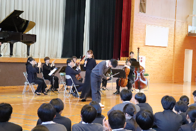 芸術鑑賞会学校行事 / 2024年11月14日 11月13日 (水) 本校体育館にて、芸術鑑賞会として、岡山フィルハーモニック管弦楽団の方々に歌唱・演奏をしていただきました。普段聞く機会があまりないプロの方々の歌唱や演奏に、生徒は感動していました。また、より演奏に親しみをもちやすいよう、楽器紹介や校歌の演奏、そして指揮者体験もさせていただき、生徒たちが音楽を心より楽しむことができる時間となりました。