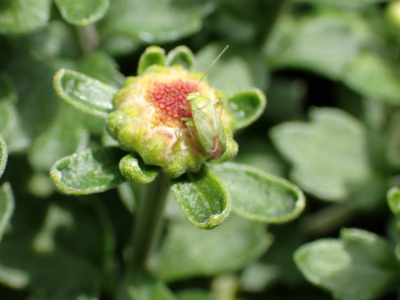 【グリーンライフコース】鉢花分野の活動紹介6グリーンライフコース / 2025年12月29日 ベルギーマムの株に飛来していた害虫の紹介です。写真の害虫は「ヨコバイ」と見られる害虫です。ヨコバイは横に這って移動することが名前の由来の吸汁害虫です。生徒たちは、栽培管理をする中で、様々な害虫を発見・鑑定し、対処・予防法を学んでいました。品質を保つためにも防除に努めたいです。