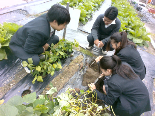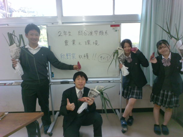 普通科2年生 総合進学類型 「農業と環境」 秋・冬野菜のシーズンです!2年生, 普通科 / 2025年11月11日 普通科総合進学類型2年生の畑では、様々な作物が栽培されています。 その中で、今週は「サツマイモ」と「ネギ」を収穫しました。 夏の暑い中での草抜きや、病害虫防除の甲斐もあってか、想定以上にしっかり美味しそうなサツマイモやネギを収穫することができました! まだまだこれから、「ハクサイ」や「ダイズ」の収穫が待っています。 美味しい作物の収穫を目指して、しっかり栽培していきます!!