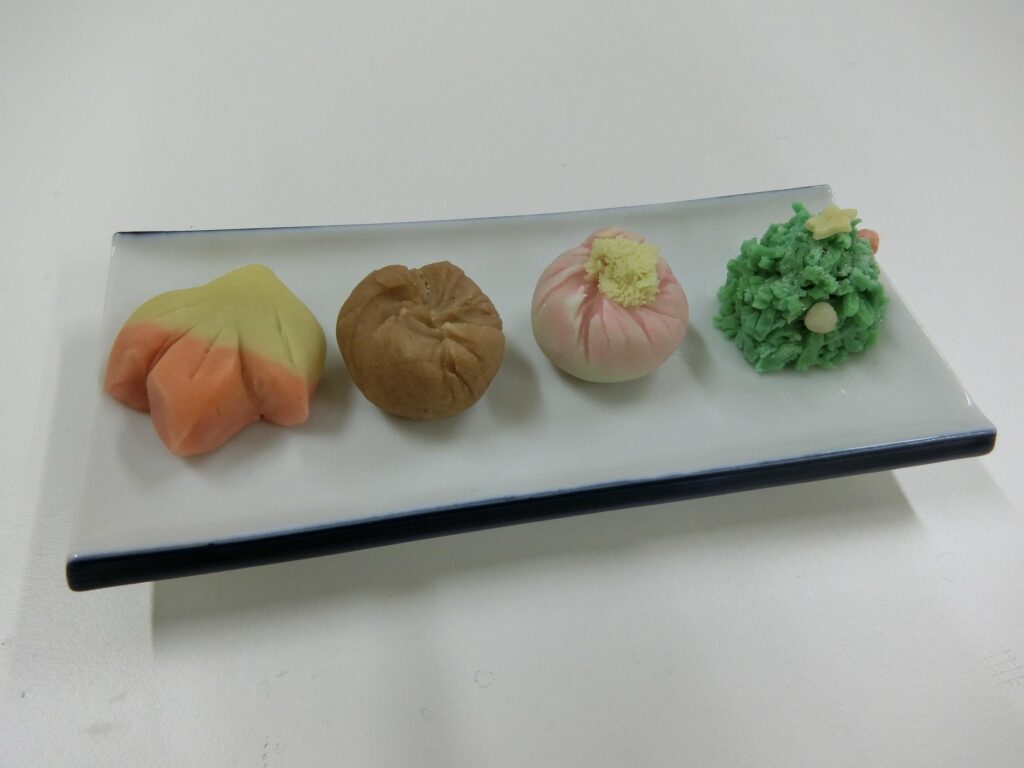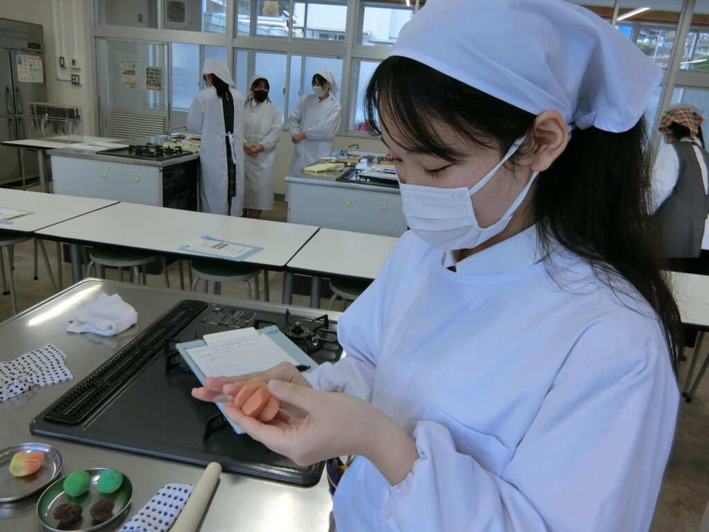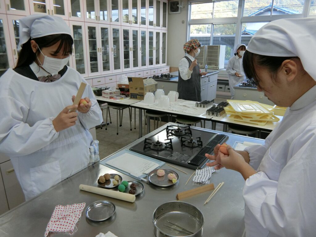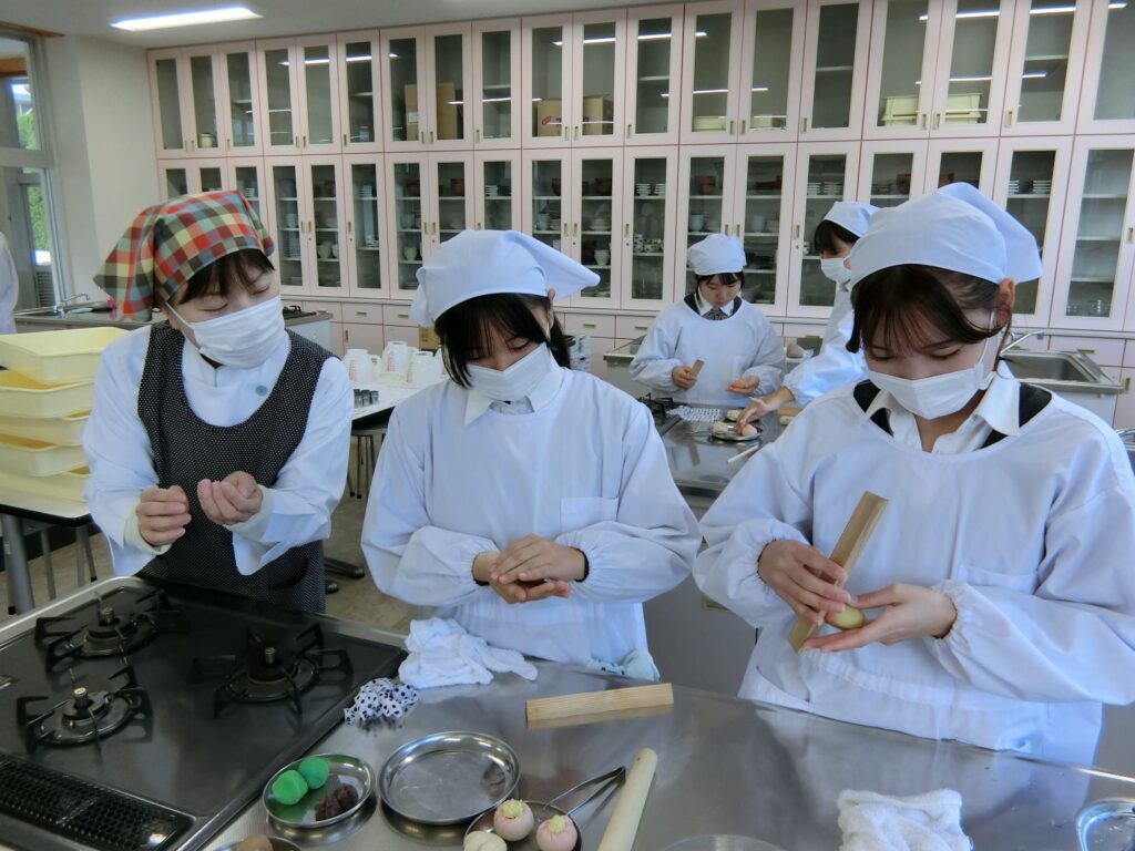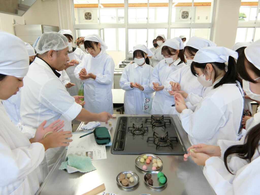 【ヒューマンライフコース2年生】第2回外部講師授業「和菓子」2年生, ヒューマンライフコース, 地域生活科 / 2025年11月21日 11月21日(金)3.4時間目に地域生活科ヒューマンライフコース2年生フードデザインの授業で第2回外部講師授業「和菓子」が行われました。地元の和菓子店「古月堂」の矢違敏文先生からご指導いただき、本格和菓子に挑戦しました。洋菓子は作った経験はあっても、和菓子づくりは初めてという生徒が多く、生徒はワクワクした様子で実習に臨みました。普段はあまり触れることもない道具に戸惑う場面もありましたが、先生から指使いや道具の持ち方など、細かい作業を丁寧にご指導いただき、次第に手つきも慣れていきました。完成した和菓子は、どれも季節感あふれる美しい仕上がりでした。貴重な学びの機会をいただき、和菓子の魅力に触れるよい時間になりました。講師:御菓子司 古月堂 矢違 敏文 先生献立:栗きんとん、季節の練り切り3種(紅葉、椿、ツリー)
