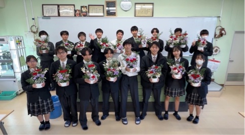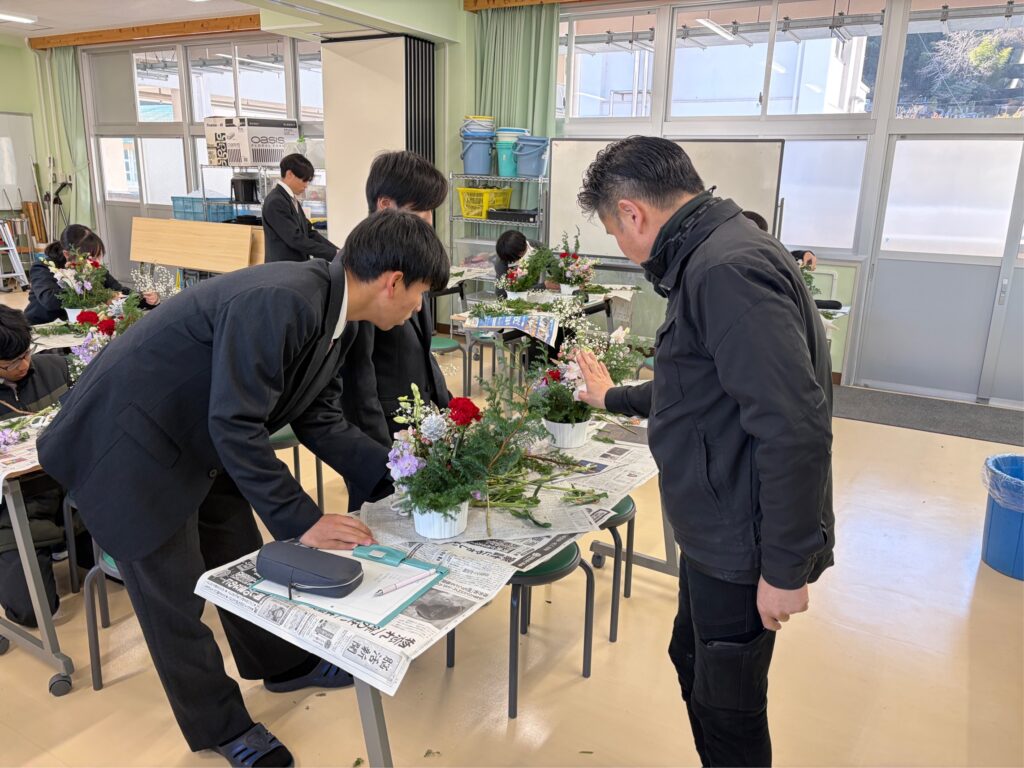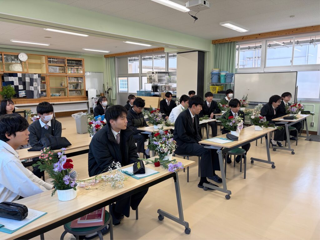 【グリーンライフコース2年生】フラワーアレンジメント2年生, グリーンライフコース, 地域生活科 / 2025年12月16日 12月15日(月)、地域生活科グリーンライフ2年生が「フラワーアレンジメント」を制作しました。 講師として、地元(井原町)の花屋である黒崎花店の黒崎様をお招きし、フラワーアレンジメントの作り方を教えていただきました。 今回使用した花材は、カーネーション、カスミソウ、ストック、デンファレ、ヒペリカム、サツマスギ、松かさです。多くの生徒にとってフラワーアレンジメントは初めての体験でしたが、デモンストレーションを交えた丁寧な説明のおかげで、それぞれの個性が生かされた作品が完成しました。 【生徒感想】「地域の花屋さんから直接教えていただき、貴重な体験になりました。花の仕事にも興味がわきました。」「花の向きや高さを考えるのが難しかった。でも、講師の先生に教えてもらいながら作ったことで、きれいに仕上げることができた。」 作品は今週末まで生徒昇降口に展示しています。ぜひご覧ください!