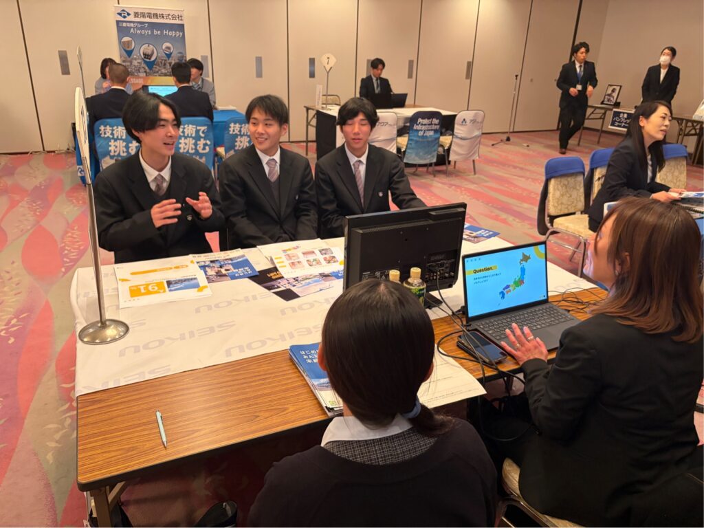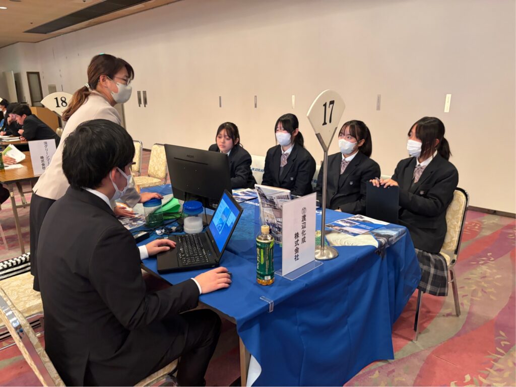 【地域生活科2年生】企業説明会 参加2年生, グリーンライフコース, ヒューマンライフコース, 地域生活科 / 2025年12月17日 12月16日(火)、地域生活科2年生が、笠岡グランドホテルで初めて開催された企業説明会および就職支援セミナーに参加しました。 当日は21社の企業様にご参加いただき、1回20分の説明会を4回受講しました。また、企業説明会後には就職支援セミナーが行われ、学生と社会人の違いや第一印象の重要性について学ぶことができました。●生徒感想『企業説明会と就職支援セミナーに参加し、働くことについて考える良い機会になりました。社会人としてのマナーや第一印象の大切さを学び、将来に向けて意識していきたいと思いました。』