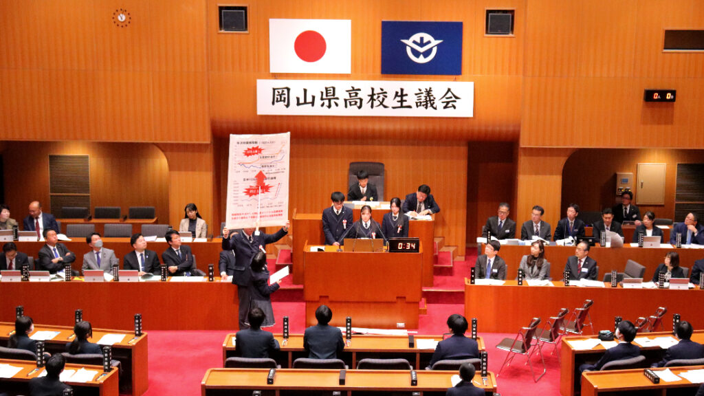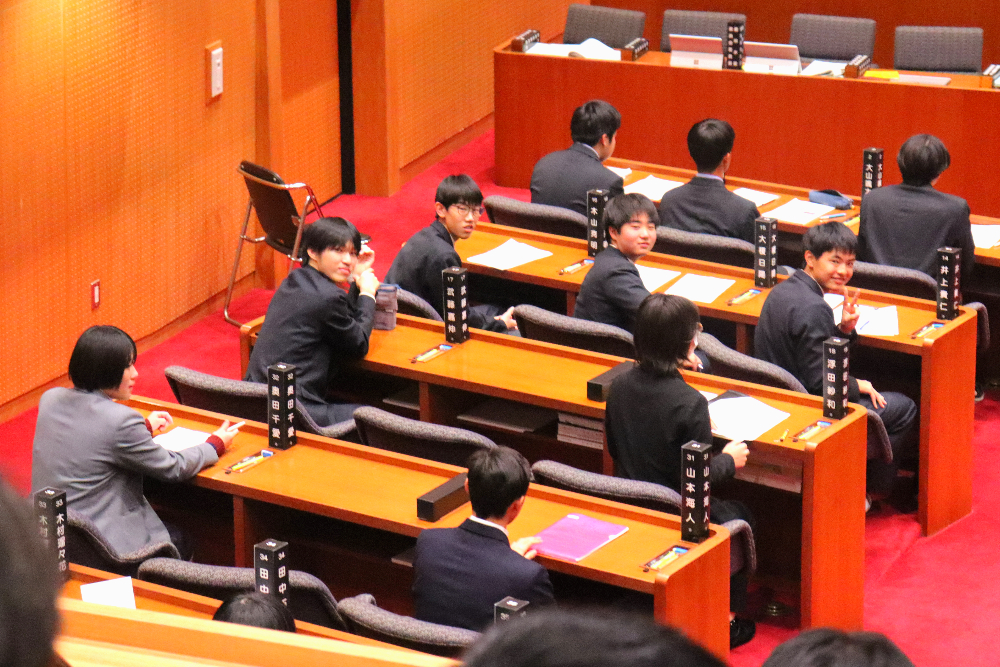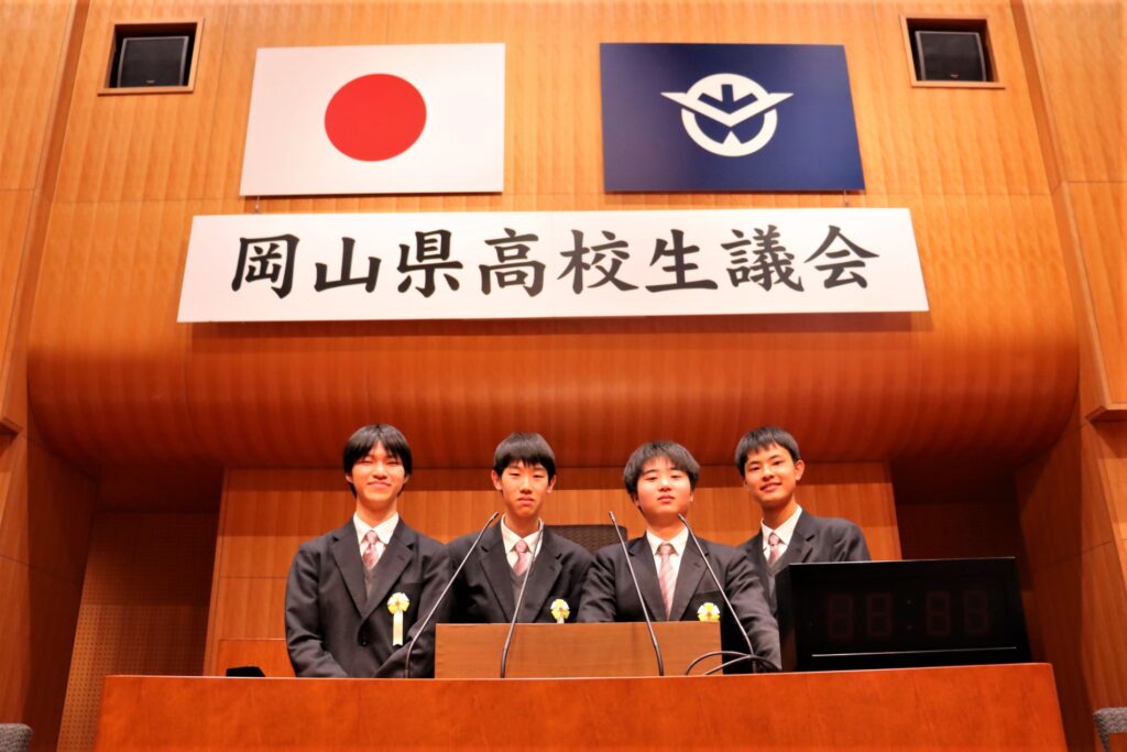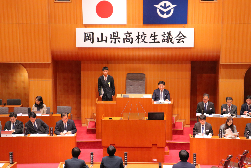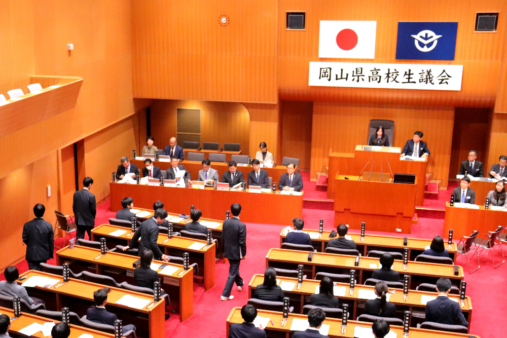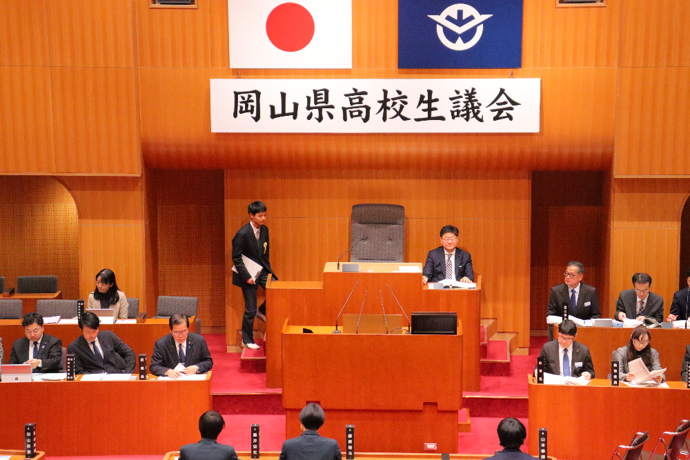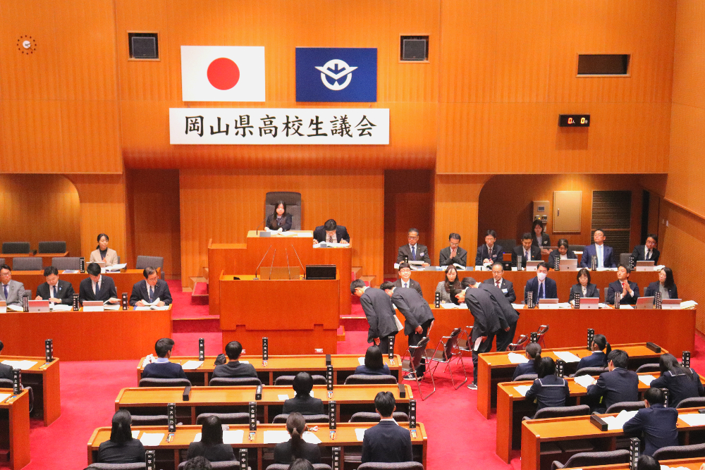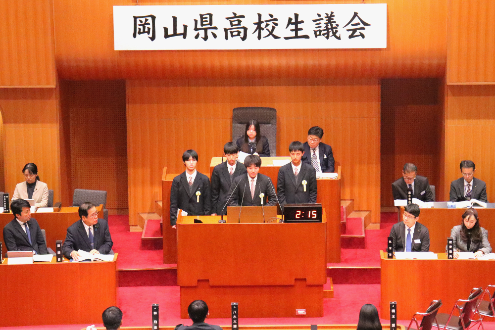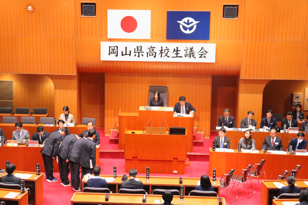 県政を実感! 岡山県高校生議会に参加しました。2年生, 活動報告 / 2025年12月23日 12月15日(月)、2年生から選出された4名の生徒が、県庁で行われた岡山県高校生議会に参加しました。 この行事は、「次代を担う高校生に、県政や県議会への理解と関心を高めてもらうとともに、様々な意見を今後の県議会での議論の参考とするため」、岡山県議会、岡山県、岡山県教育委員会、岡山県選挙管理委員会が主催となって行われました。 午前中の審議では、2年B組の井上貴仁君が、議長の大任を務めました。 中央奥が議長席です。 井上議長の進行で、創志学園高等学校の議員が農政について質問しています。 午前中の審議の後は、昼食休憩です。 地下一階にある「おかやま晴れの国食堂」でランチを済ませた4人が、9階大会議室のベランダで寛いでいます。 岡山城の黒い天守がちょうど目の高さに見えています。 当日は県下から18校、70名の生徒が集まりました。 井原高校の質問は、13番目(午後の5番目)です。 議員席の大きな椅子に腰掛けて、午後の審議が始まるのを待ち構えています。 「井原高等学校 井上貴仁議員、大榎日向議員、木山堯明議員、武藤嘉伸議員に発言を許します。」 【井原高校代表議員の質問(骨子)】 最近の県知事選挙の結果を踏まえると、若者の投票率は依然として低い状況にあります。その要因は様々ですが、投票によるメリットが不十分であることも一因ではないでしょうか。若者の投票率を上げ、政治参加を促すためにも、投票済証明書などをクーポン代わりに登録店舗で特典が受けられる「センキョ割」を積極的に宣伝したり、これを発展させ、県や市町村の公共施設を割引するようにしてはどうでしょうか。また、投票率向上に向けて、今後、どのような取組を行うのか、併せて総務委員長にお伺いします。 「若者の政治参加を促進することは大切なことです。しかし、県(=行政)が直接『センキョ割』を実施することは、公職選挙法に抵触する可能性があります。ですから、県といたしましては、民間で行われている『センキョ割』の活動を知っていただくなど、若い世代の皆さんがもっと選挙に参加してくださるよう努めてまいります。」 ・・・岡山県議会総務委員会委員長の河野慶治議員より答弁をいただきました。 議長に向かい、深く一礼して、席に戻ります。 5分間という短い時間でしたが、4人は議員としての使命を堂々と果たすことができました。 すべての審議が終わり、写真撮影タイムが始まりました。 憧れの知事席、県庁トップの副知事席、議長席の座り心地を代わる代わる存分に堪能しました。 ともすれば、遠い世界の出来事のように思われる県政をリアルに感じ取ることのできた一日でした。 岡山県高校生議会は県内のケーブルテレビで放送予定です。(12月11日現在の情報) 井原放送(1月中、時刻未定) 笠岡放送(1月24日、9:00〜 18:00〜) 倉敷ケーブルテレビ(1月17日、18日、24日、25日 各日8:00〜)