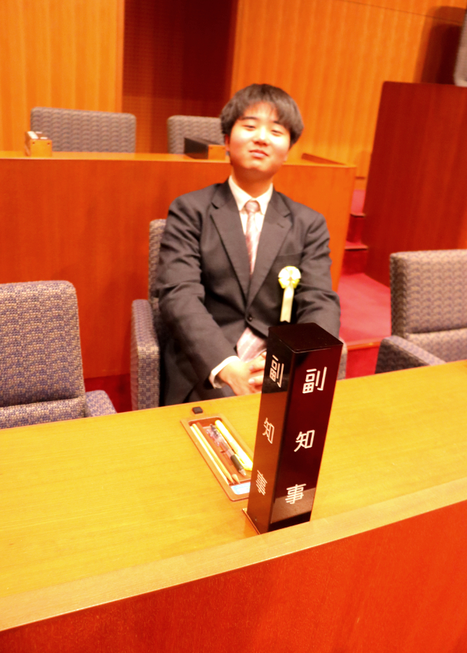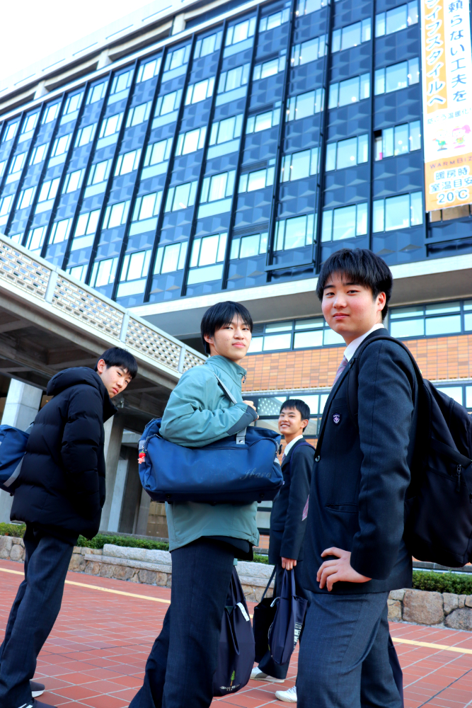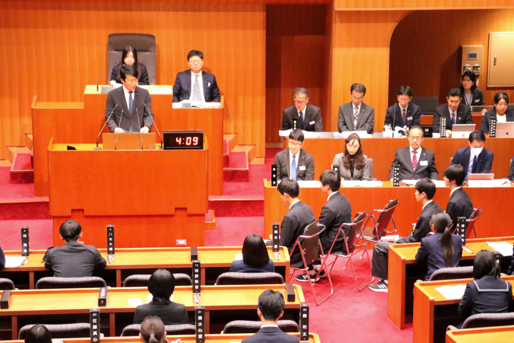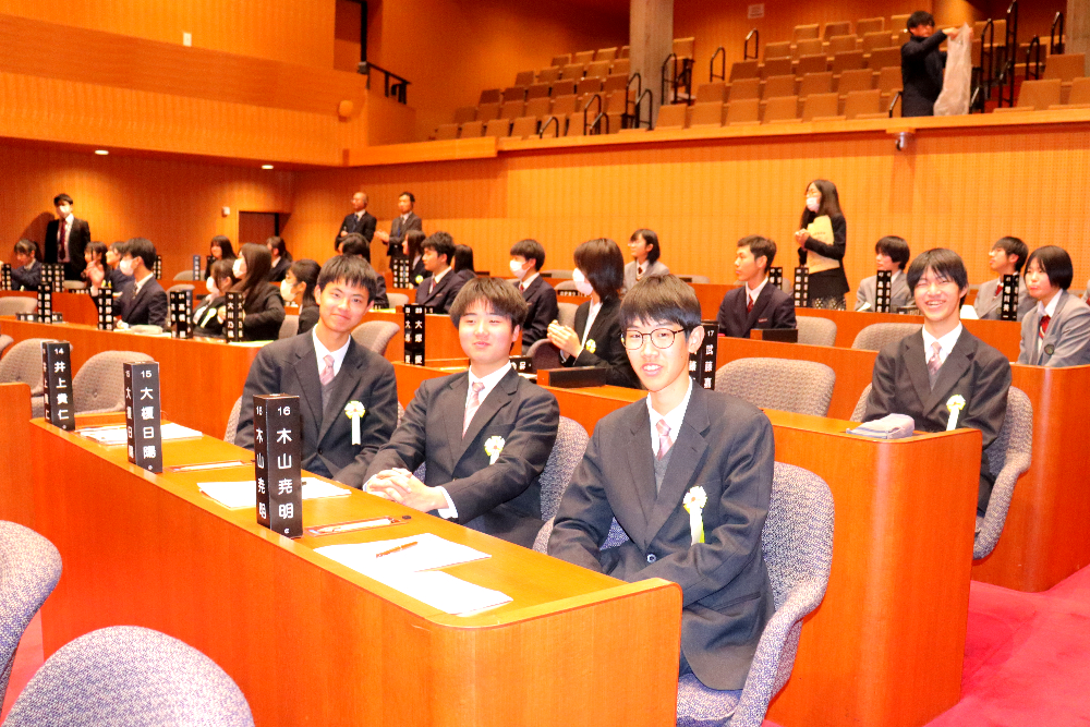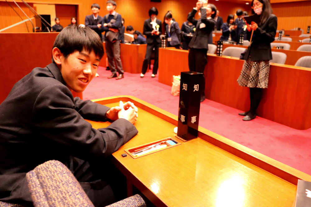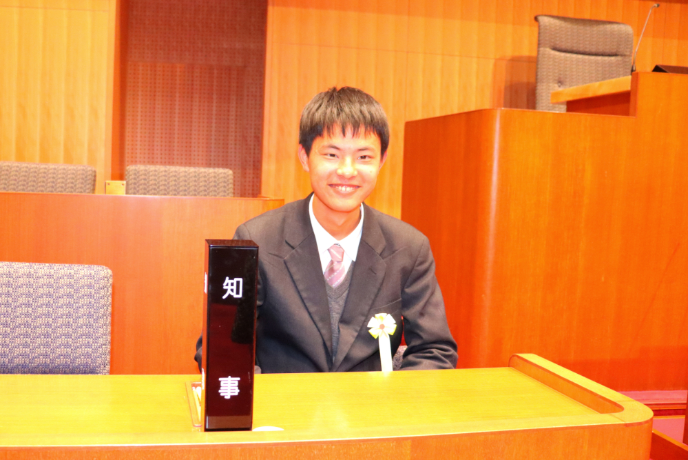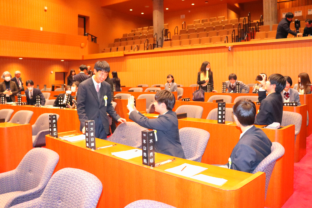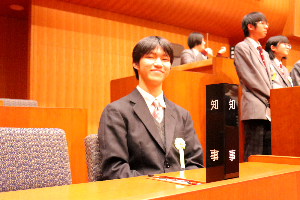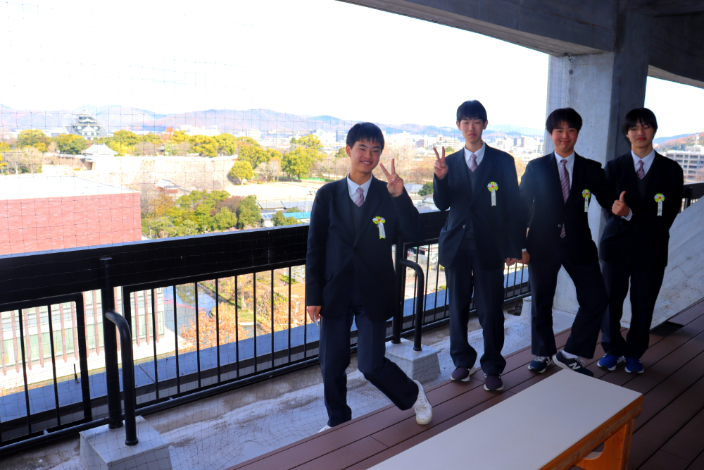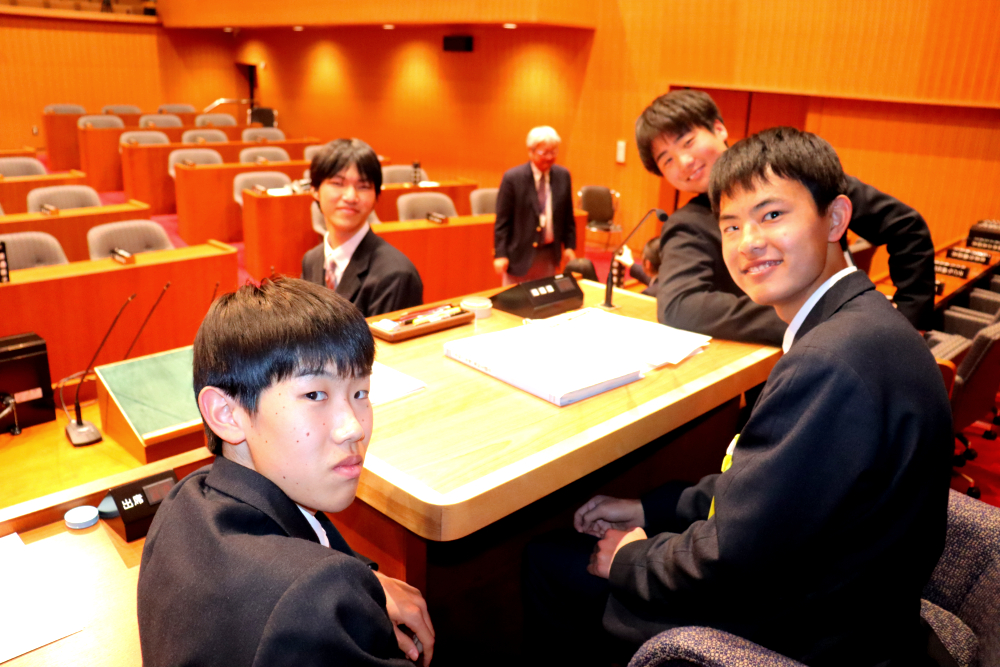 県政を実感! 岡山県高校生議会に参加しました。2年生, 活動報告 / 2025年12月23日 12月15日(月)、2年生から選出された4名の生徒が、県庁で行われた岡山県高校生議会に参加しました。 この行事は、「次代を担う高校生に、県政や県議会への理解と関心を高めてもらうとともに、様々な意見を今後の県議会での議論の参考とするため」、岡山県議会、岡山県、岡山県教育委員会、岡山県選挙管理委員会が主催となって行われました。 午前中の審議では、2年B組の井上貴仁君が、議長の大任を務めました。 中央奥が議長席です。 井上議長の進行で、創志学園高等学校の議員が農政について質問しています。 午前中の審議の後は、昼食休憩です。 地下一階にある「おかやま晴れの国食堂」でランチを済ませた4人が、9階大会議室のベランダで寛いでいます。 岡山城の黒い天守がちょうど目の高さに見えています。 当日は県下から18校、70名の生徒が集まりました。 井原高校の質問は、13番目(午後の5番目)です。 議員席の大きな椅子に腰掛けて、午後の審議が始まるのを待ち構えています。 「井原高等学校 井上貴仁議員、大榎日向議員、木山堯明議員、武藤嘉伸議員に発言を許します。」 【井原高校代表議員の質問(骨子)】 最近の県知事選挙の結果を踏まえると、若者の投票率は依然として低い状況にあります。その要因は様々ですが、投票によるメリットが不十分であることも一因ではないでしょうか。若者の投票率を上げ、政治参加を促すためにも、投票済証明書などをクーポン代わりに登録店舗で特典が受けられる「センキョ割」を積極的に宣伝したり、これを発展させ、県や市町村の公共施設を割引するようにしてはどうでしょうか。また、投票率向上に向けて、今後、どのような取組を行うのか、併せて総務委員長にお伺いします。 「若者の政治参加を促進することは大切なことです。しかし、県(=行政)が直接『センキョ割』を実施することは、公職選挙法に抵触する可能性があります。ですから、県といたしましては、民間で行われている『センキョ割』の活動を知っていただくなど、若い世代の皆さんがもっと選挙に参加してくださるよう努めてまいります。」 ・・・岡山県議会総務委員会委員長の河野慶治議員より答弁をいただきました。 議長に向かい、深く一礼して、席に戻ります。 5分間という短い時間でしたが、4人は議員としての使命を堂々と果たすことができました。 すべての審議が終わり、写真撮影タイムが始まりました。 憧れの知事席、県庁トップの副知事席、議長席の座り心地を代わる代わる存分に堪能しました。 ともすれば、遠い世界の出来事のように思われる県政をリアルに感じ取ることのできた一日でした。 岡山県高校生議会は県内のケーブルテレビで放送予定です。(12月11日現在の情報) 井原放送(1月中、時刻未定) 笠岡放送(1月24日、9:00〜 18:00〜) 倉敷ケーブルテレビ(1月17日、18日、24日、25日 各日8:00〜)