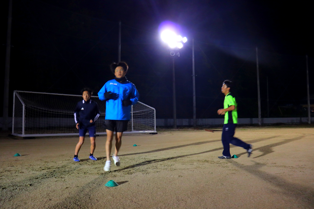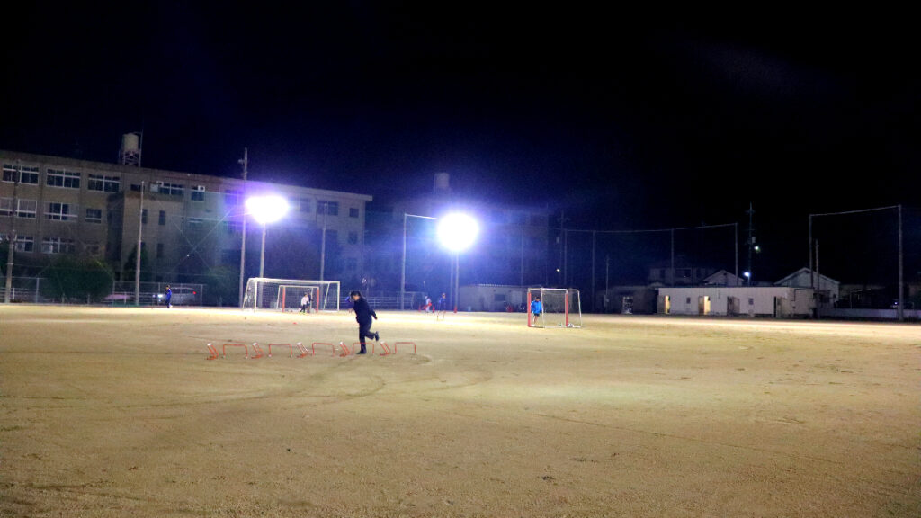 サッカー部の練習場はナイター照明完備です!サッカー部 / 2025年12月24日 サッカー部が練習場として井原市からお借りしている旧南校地グラウンドにはナイター照明が完備されています。 日没が早い晩秋から冬にかけても、選手たちは時間を気にすることなく練習に打ち込めるのです。 時には80分に及ぶ試合時間を戦い抜く体力と気力、体幹を鍛え上げるため、日々の練習ではサーキットトレーニングに力を入れています。 井原高校には、本気でサッカーに取り組める環境が整っています。 サッカーをこよなく愛する中学生⋯小学生の君、来たれ、井原高校サッカー部へッ!!