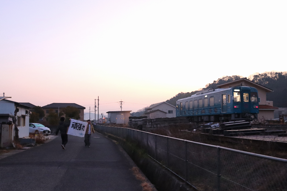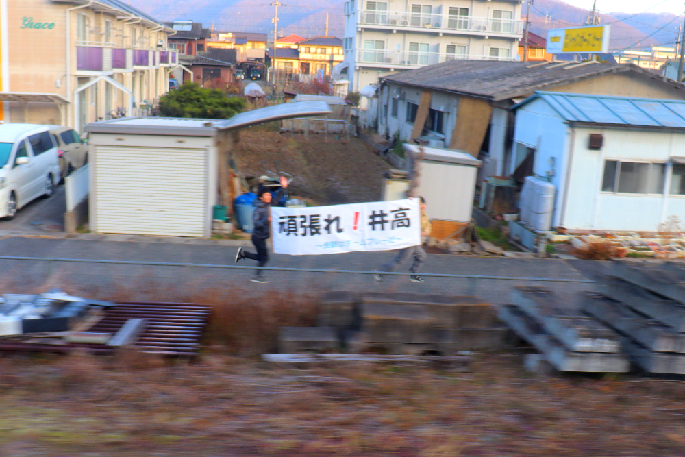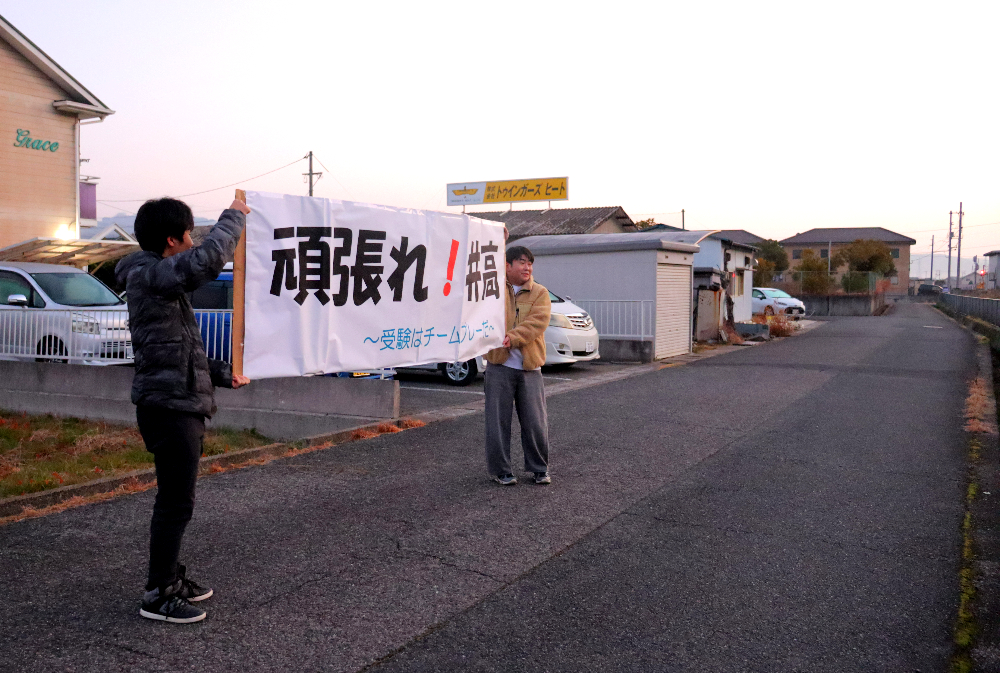 受験はチームプレーだ! 共通テスト受験生を同級生が応援3年生, 普通科 / 2026年1月17日 1月17日(土)午前6時57分、天気快晴、井原駅にほど近い線路のそばに横断幕を持った二人の男子生徒が立っています。 清音行の上り列車が、コマツSA6D125H-1Aエンジンの音を高らかに響かせながらやって来ました。 頑張って来いよ〜!二人は列車に向かって走り出しました。 進路が決まった生徒が、共通テストへ向かう同級生を応援しているのです。 頑張れ!井高 〜 受験はチームプレーだ 〜