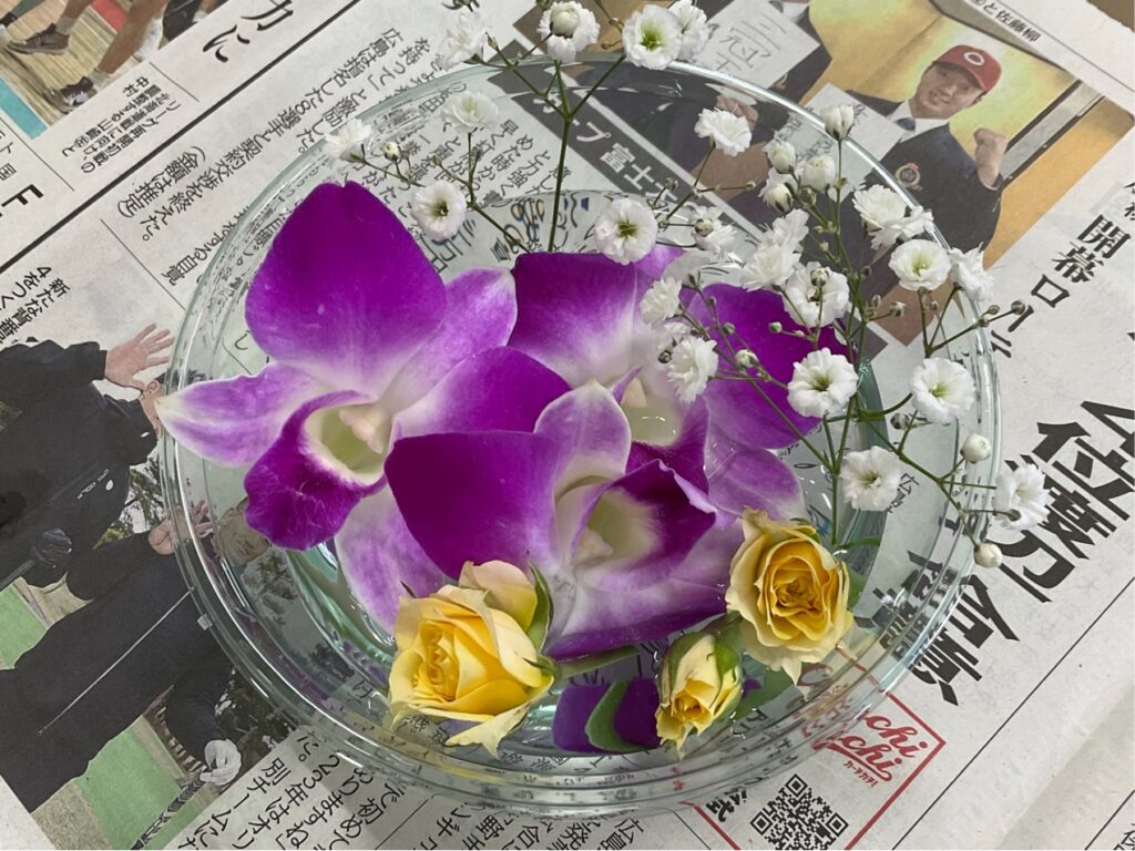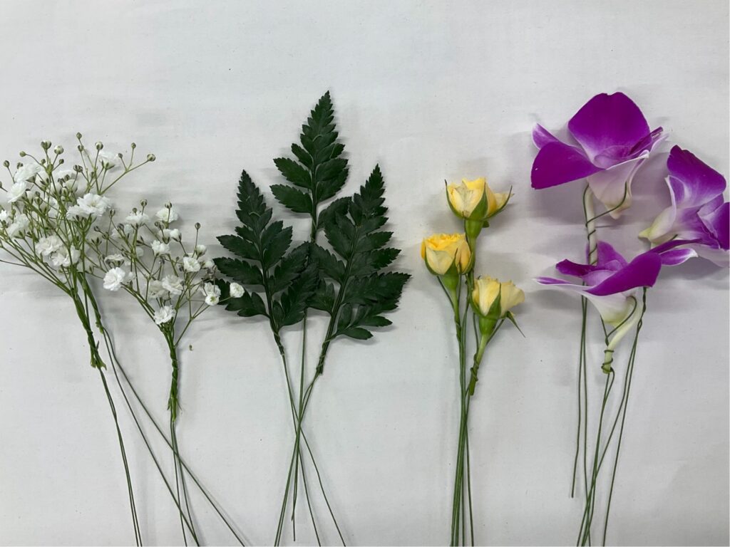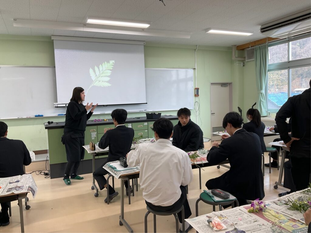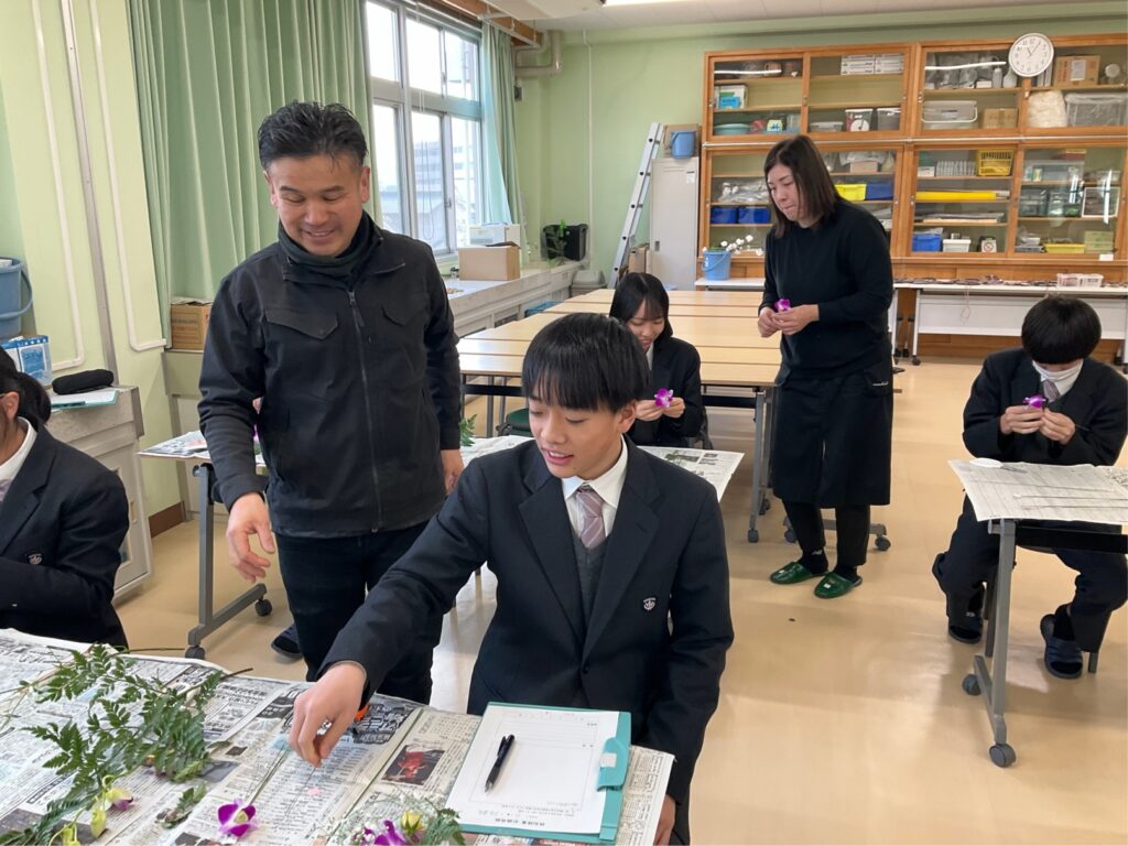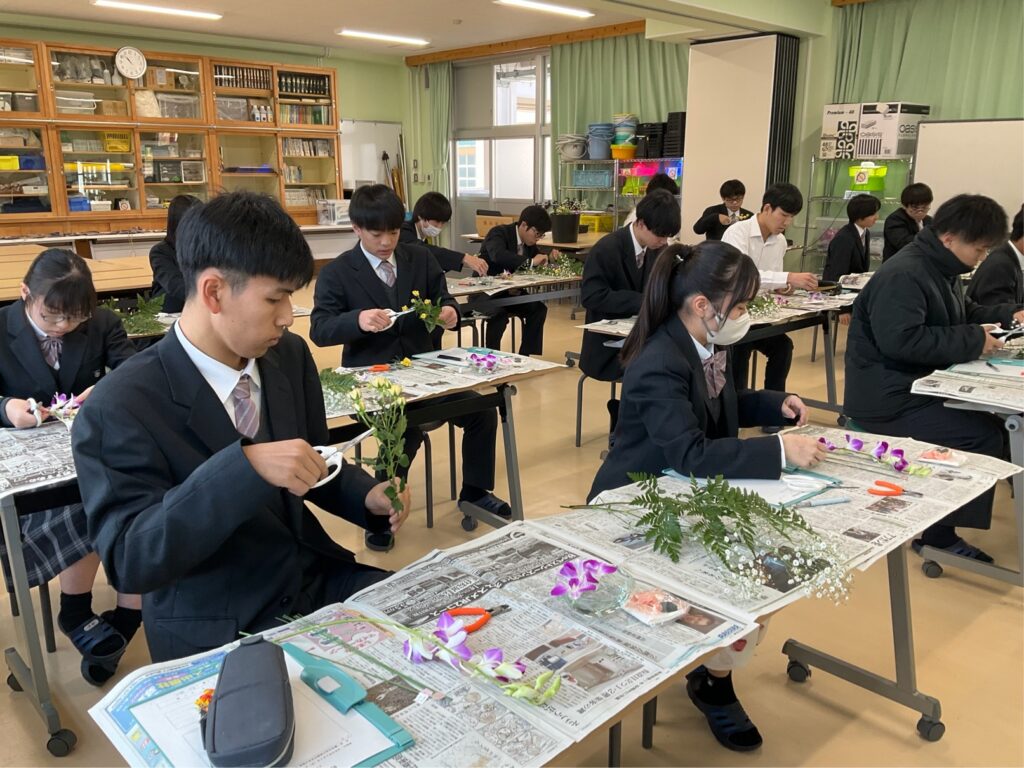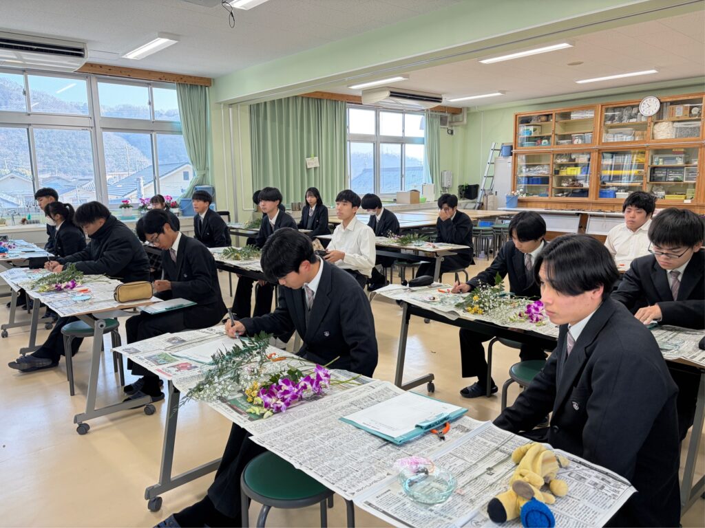 【グリーンライフコース2年生】外部講師授業「コサージュ制作」2年生, グリーンライフコース, 地域生活科 / 2026年2月2日 【グリーンライフコース2年生】外部講師授業「コサージュ制作」2月2日(月)、地域生活科グリーンライフコース2年生が、生花を使った「コサージュ制作」に取り組みました。当日は、地元・井原町で生花店「黒崎花店」を営まれている黒崎様を外部講師としてお招きし、生花を使用したコサージュの作り方を教えていただきました。今年が初めての開催ということもあり、最初は不安そうな様子の生徒も見られましたが、講師の先生の丁寧なご指導のおかげで、最終的には一人ひとりが素敵な作品を完成させることができました。使用花材:デンファレ、SPバラ、カスミソウ、レザーファン 【生徒の感想】◯「外部講師の先生から、実際の現場で必要とされる技術や工夫を教えていただき、将来について考える良い機会になりました。」◯「2年生になり専門的な内容が増える中で、コサージュ制作を体験でき、とても勉強になりました。」