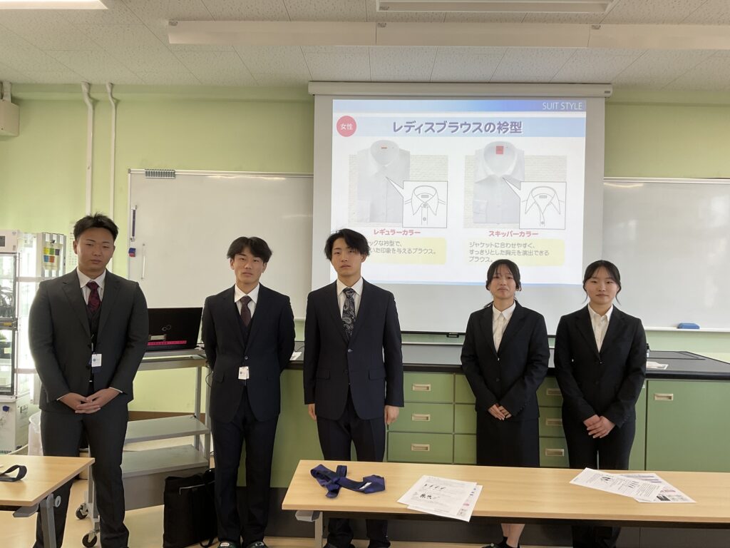 【3年生】スーツ着こなし講座3年生, 進路 / 2026年2月18日 2月17日(火)、地域生活科3年生と、普通科就職希望者を対象に「スーツ着こなし講座」を実施しました。今回は「洋服の青山」より2名の方を講師にお招きし、社会人としての第一歩となる「身だしなみ」についてご講話いただきました。講座では、まず「おしゃれ」と「身だしなみ」の違いや、相手に信頼感を与える重要性について学びました。その後、実際に5名の代表生徒がスーツを着用し、生徒全員の前でモデルとして登壇しました。プロのアドバイスを受けながら正しくスーツを着こなした生徒たちの姿はとても凛々しく、実際にスーツを着用した生徒からは「少し大人になった気分がする」といった感想が出て、会場は和やかながらも引き締まった空気に包まれました。また、着こなしだけでなく「ネクタイの結び方」や「スーツのお手入れ」についても指導いただきました。長く大切に着るためのケア方法は、これから社会に出る生徒たちにとって非常に役立つ知識となりました。井原高校での生活も残りわずかとなりました。今日、身につけた知識と、スーツを着た時の気持ちを大切に、自信を持って社会へと羽ばたいてほしいと思います。