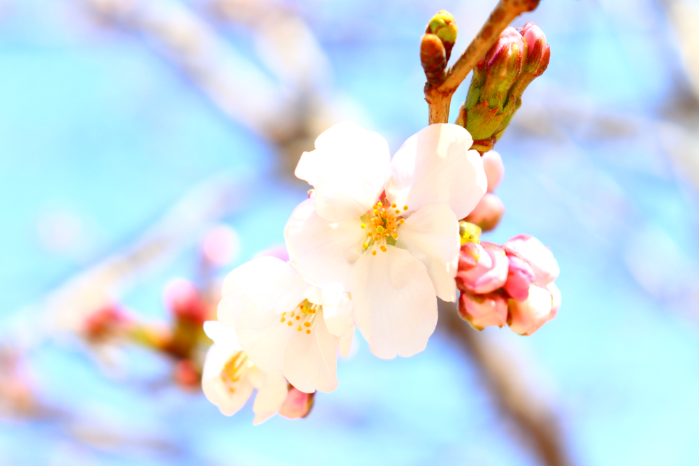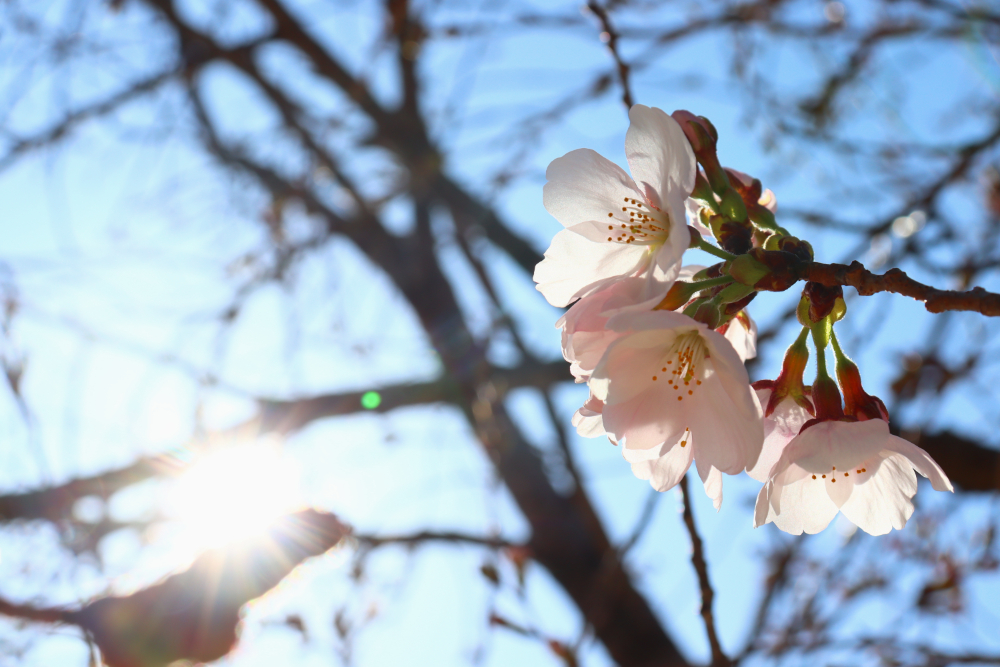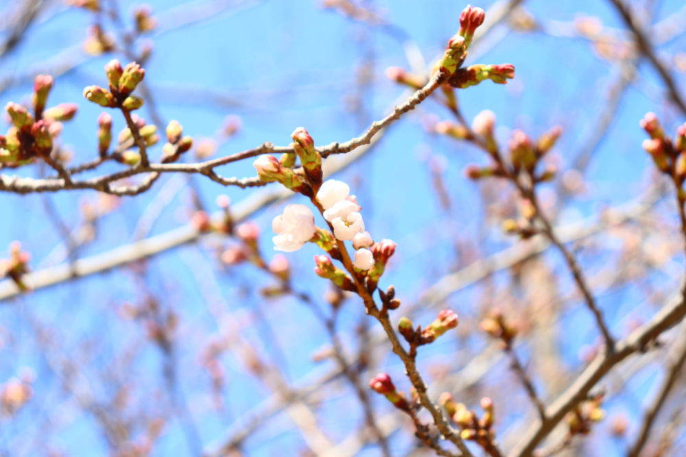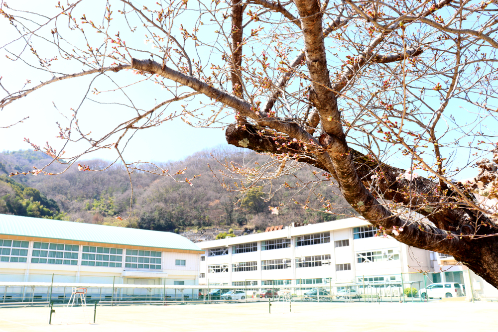 校庭の桜が咲きました!校内風景 / 2026年3月24日 3月24日、よく晴れた火曜日は朝から気温がぐんぐん上がり、正午過ぎには15℃を越えました。生物教室のそばにある屋外水槽では、理科の先生がメダカの様子を確かめています。 先生の背中の桜をよく見ると、何やら白く輝くものが! 目を凝らすと、そこかしこに今年いちばん最初の桜が咲いています。 明後日の3月26日(木)は入学準備説明会。 井原高校は間もなく令和8年度新入生を迎えます。