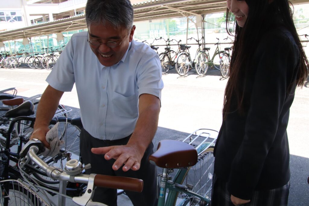 【交通委員】自転車点検&昼休みの一コマ。生徒会 / 2026年4月16日 令和8年4月16日(木)。井原高校の昼休み。井原高校では、4月8〜17日まで、昼休み等を利用して、自転車点検を行っています。2,3年生はもちろん、1年生は新しい自転車もたくさんあり、担任の先生のチェックを受けて、許可のステッカーを貼っていました。道路交通法も4月から改正され、青色切符も導入されました。今まで以上に交通安全に気をつけて、登下校して欲しいと思います。 今日は昨日とは違い、快晴の空の下、1年生は中庭で友だちと楽しく、保護者の作ってくださったお弁当に舌鼓を打っています。それを、2年生が2階から微笑ましく見ている姿も見受けられます。