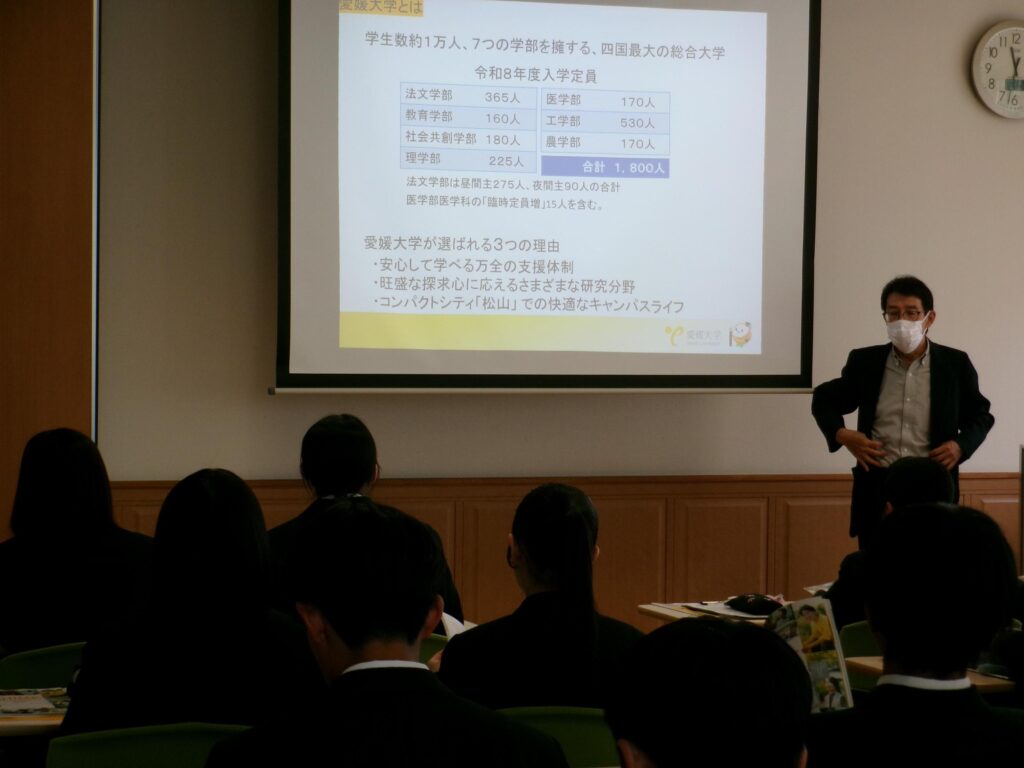 【普通科2年生】大学訪問研修 〜愛媛大学〜2年生, 普通科 / 2026年4月17日 令和8年4月17日、普通科2年生約34名で愛媛大学を訪問しました。 大学の全体説明の後、学生スタッフESMOの方と3グループに分かれて座談会をしました。 大学内の食堂で美味しい昼食を食べた後、ESMOスタッフにキャンパス内を案内していただきました。 松山は街の雰囲気も良く、大学生活を送るには最高の場所だと思いながらバスに乗り、大学を後にしました。スタッフのみなさん、そして、忙しい授業の合間にわざわざ対応いただいた学生のみなさん、 本当にありがとうございました!