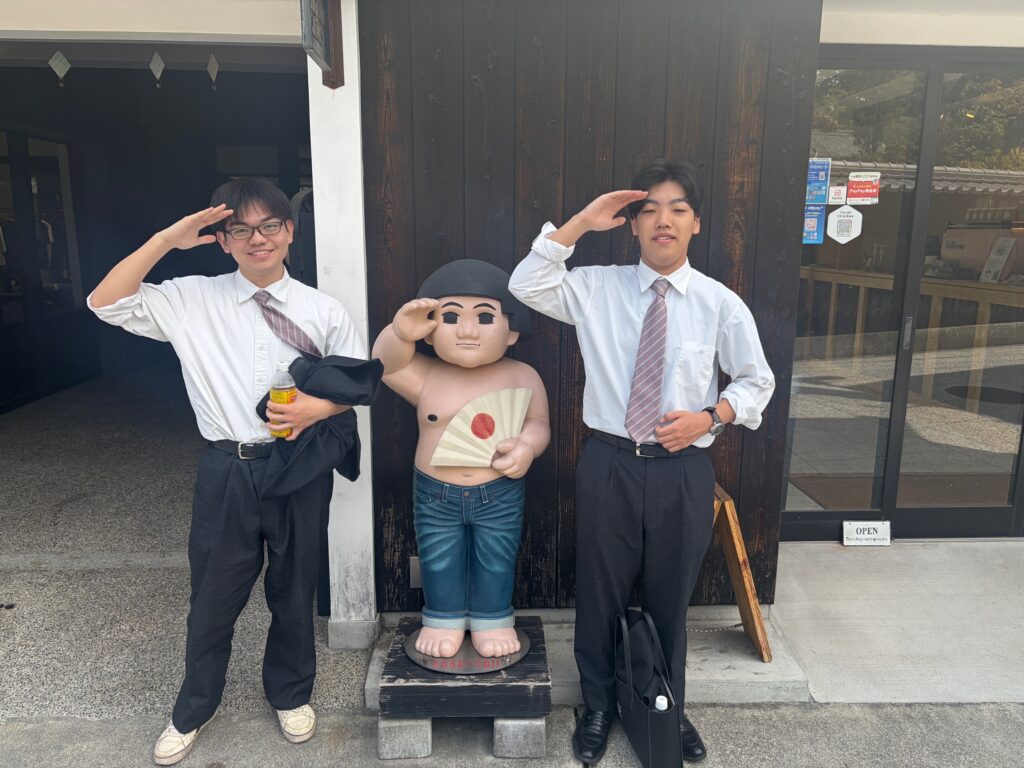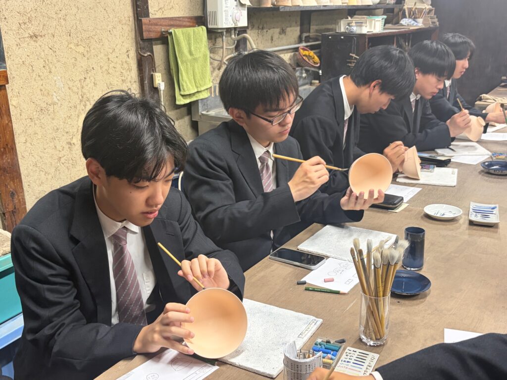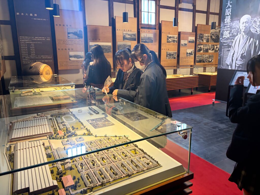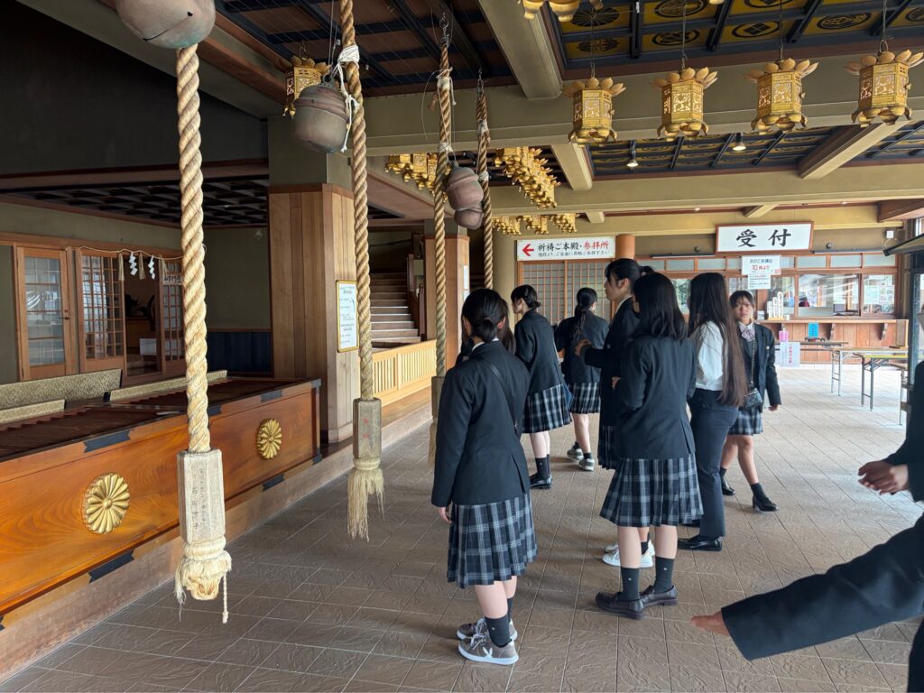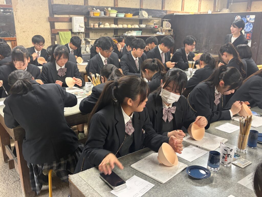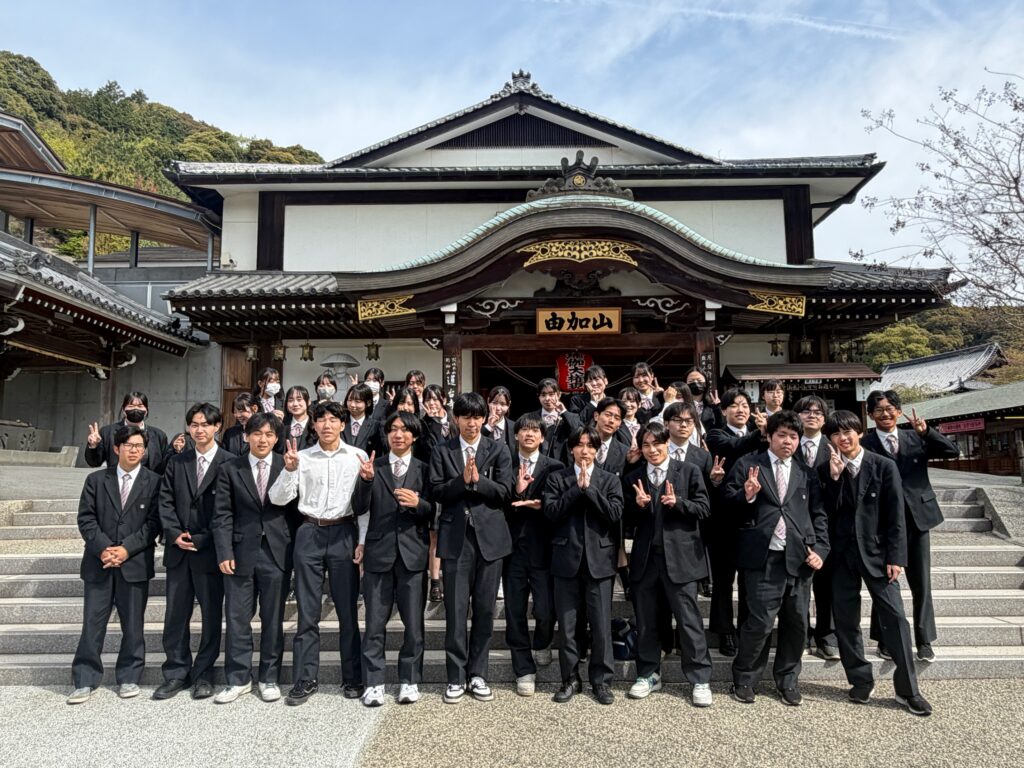 【地域生活科3年】1日研修3年生, グリーンライフコース, ヒューマンライフコース, 地域生活科 / 2026年4月17日 晴天に恵まれた4月17日(金)、地域生活科3年生が倉敷市で校外研修を行いました。 午前中は、由加山 蓮台寺を訪れ、全員で進路実現に向けて合格祈願を行いました。生徒たちは、それぞれの目標に思いを込め、真剣に手を合わせていました。その後、ジーンズストリートでは児島ならではのジーンズ文化に触れ、地域の特色について理解を深めました。また、倉紡記念館では、地域産業の歴史について学びました。さらに、倉敷アイビースクエアではテーブルマナー研修を行い、食事の作法について実践的に学びました。同館内で行ったお茶碗の絵付け体験では、各自が工夫を凝らし、世界に一つだけの作品を制作しました。なお、作品は焼成後(約2か月後)に届く予定です。最後に、倉敷美観地区を散策し、歴史ある町並みを楽しみながら研修を締めくくりました。今回の研修を通して、生徒たちは地域の魅力や文化への理解を深めるとともに、進路に対する意識を高めることができました。